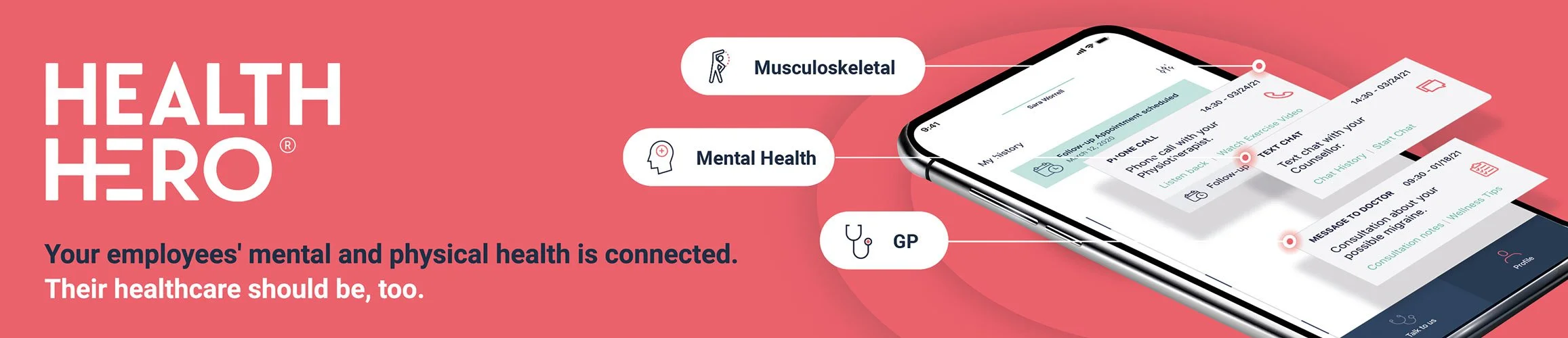 Design a series of adverts to appear in the Guardian, The Times and Wired Magazine targeting business owners and HR leaders explaining that HealthHero provides a digital health app offering mental, physical and muscular-skeletal healthcare.