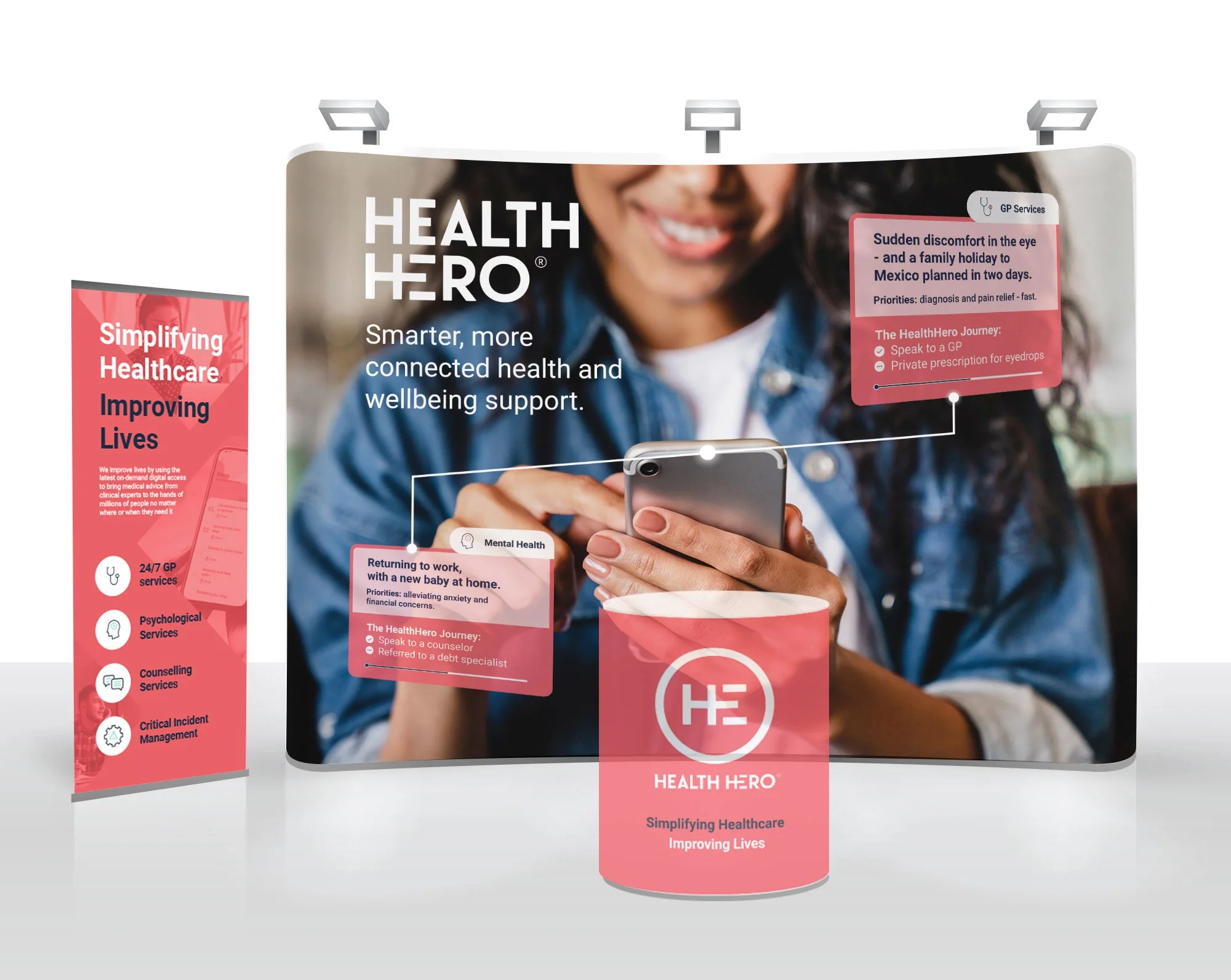 Design an event stand to promote HealthHero that explains their product: an app for employees granting a single point of access to a connected healthcare ecosystem.