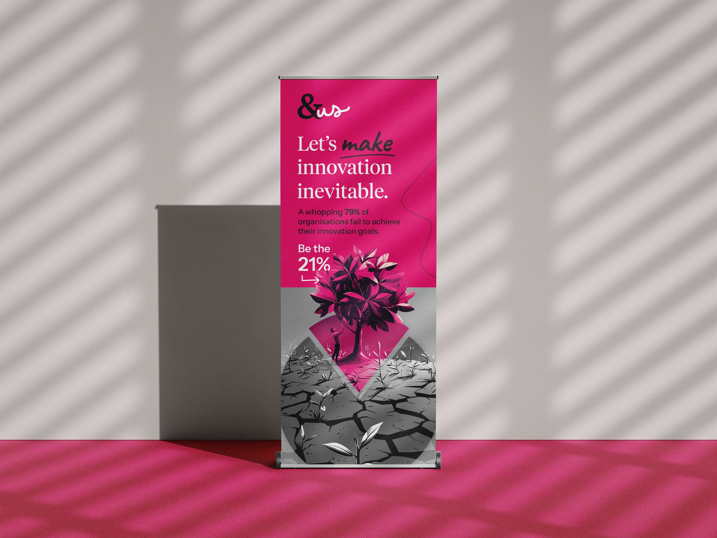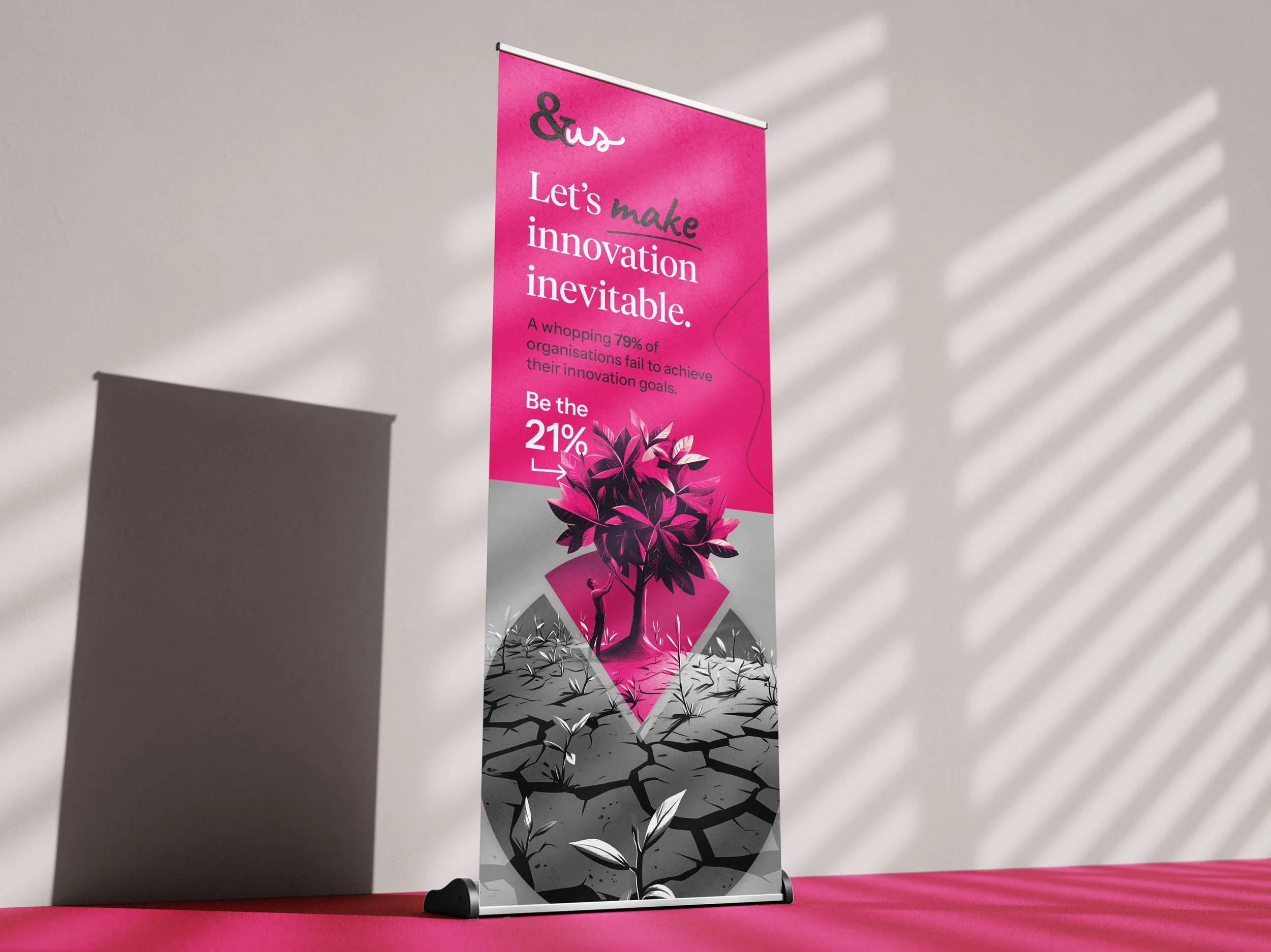 They needed 2 roller banners to promote their unique approach to helping businesses innovate. I designed a pie chart showing the percentage of businesses that achieve their innovation goals as a tree sprouting in a barren landscape.